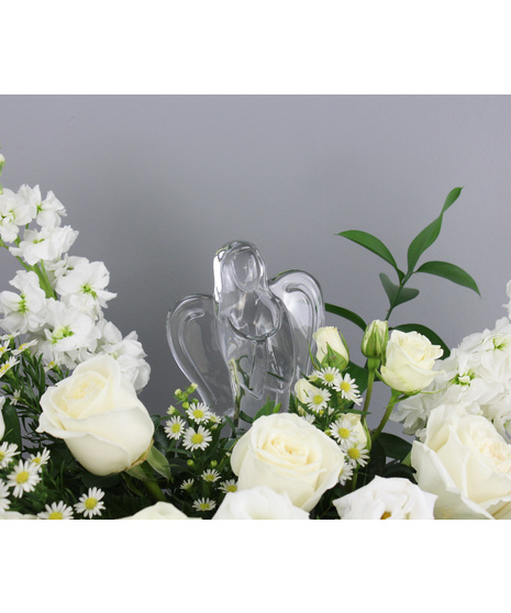 Honor a loved one’s memory with Precious Angel, a serene one-sided sympathy arrangement featuring a graceful crystal angel. Presented in a simple plastic container, this all-white design radiates purity and peace with elegant roses, spray roses, lisianthus, stock, Monte Casino, and assorted greenery. Thoughtfully arranged, Precious Angel offers a gentle expression of love, remembrance, and comfort during times of loss.