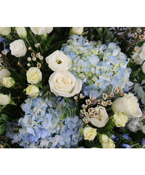 Tranquil Blue Standing Spray is a graceful expression of sympathy, designed to offer comfort and peace during times of loss. Displayed on a 60" easel, this elegant arrangement features soft blue hydrangea accented by white roses, white snapdragons, white lisianthus, white waxflower, and white spray roses. Light blue delphinium adds gentle height and movement, creating a serene blend of calming blue and pure white tones. Thoughtfully composed, this standing spray conveys heartfelt condolences and a sense of quiet remembrance.
