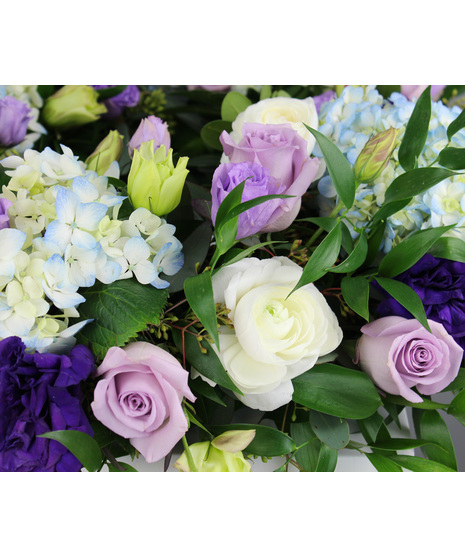 Valley of Violets is a serene and elegant cremation wreath designed to convey peace, remembrance, and gentle beauty. The arrangement features a harmonious blend of soft lavender roses, creamy white ranunculus blooms, and delicate clusters of pale blue hydrangeas, creating a soothing, pastel palette. Rich violet lisianthus add depth and contrast, symbolizing dignity and everlasting love. Lush green foliage frames the wreath, giving it a natural, garden-like fullness while enhancing the softness of the florals. The circular shape represents eternity and continuity, making it a meaningful tribute for honoring a loved one’s memory.
