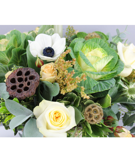 Warm, welcoming, and full of rustic charm — Homestead Glow captures the cozy spirit of Thanksgiving. Designed in a golden pedestal vase, this inviting arrangement features soft yellow roses, white anemones, ornamental kale, and clusters of broomcorn accented with fresh greenery and natural lotus and scabiosa pods. A single sage taper candle rises at the center, casting a gentle light that evokes the comfort of home and the warmth of gathering around the harvest table.