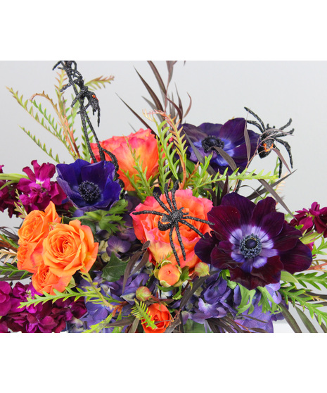 Darkly dramatic with a touch of sparkle, Wicked Web is a Halloween showstopper arranged in a clear green cylinder. Lush purple hydrangea and anemones set a moody foundation, while vibrant Free Spirit roses, orange spray roses, and fuchsia stock add pops of fiery color. Wisps of agonis weave through the design, echoing the look of tangled branches. Finished with black and orange glittered spiders, this arrangement brings the perfect mix of spooky and stylish—ideal for Halloween celebrations or a bold seasonal centerpiece.