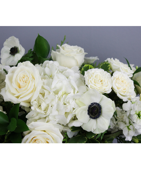 Celebrate the beauty of the season with this elegant long and low centerpiece. Silver Bells is artfully designed in a sleek rectangular silver vase and features a graceful blend of white hydrangea, white anemones, white spray roses, and white stock. Accented with lush assorted evergreens, this centerpiece captures the timeless charm of a white Christmas — perfect for adding a touch of winter elegance to your holiday table.