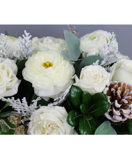 Snowfall Elegance is a modern winter centerpiece that captures the quiet beauty of a fresh snowfall. Designed in a sleek rectangular glass vase, the arrangement features a refined leaf wrap lining the inside for a clean, polished finish. A luxurious blend of white ranunculus, white spray roses, and classic white roses creates a soft, monochromatic bloom palette, while dusty greenery adds gentle depth and texture.